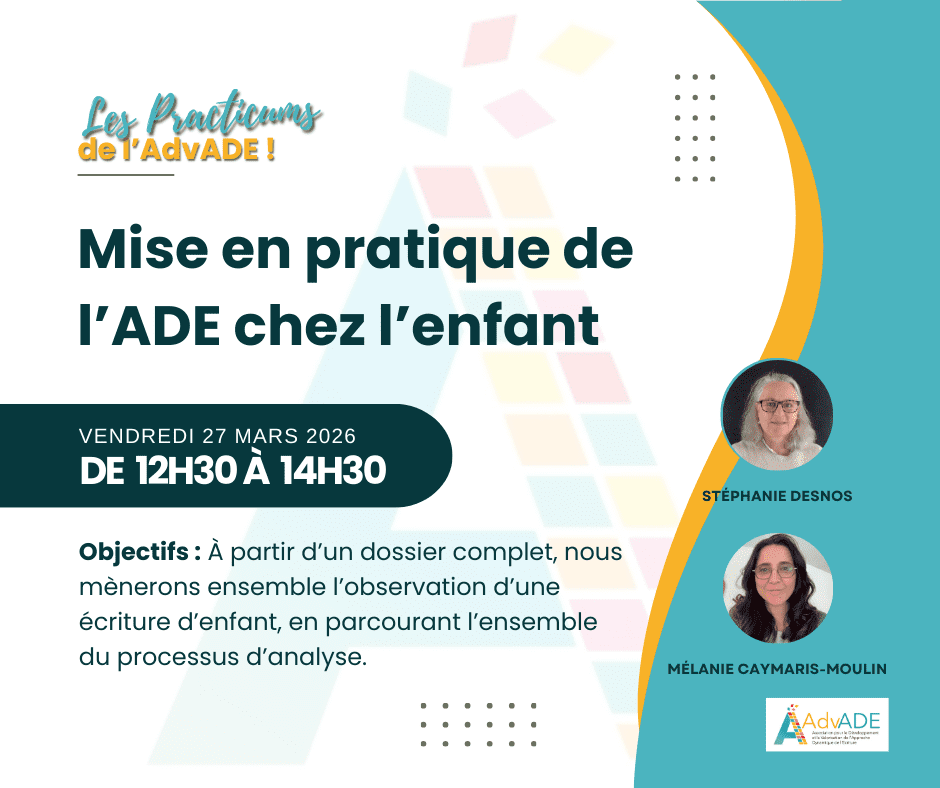 L'AdvADE a le plaisir de convier tous les adhérent(e)s au prochain Practicum de l'Association consacré à la mise en application pratique de la méthode ADE chez l'enfant.